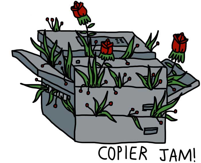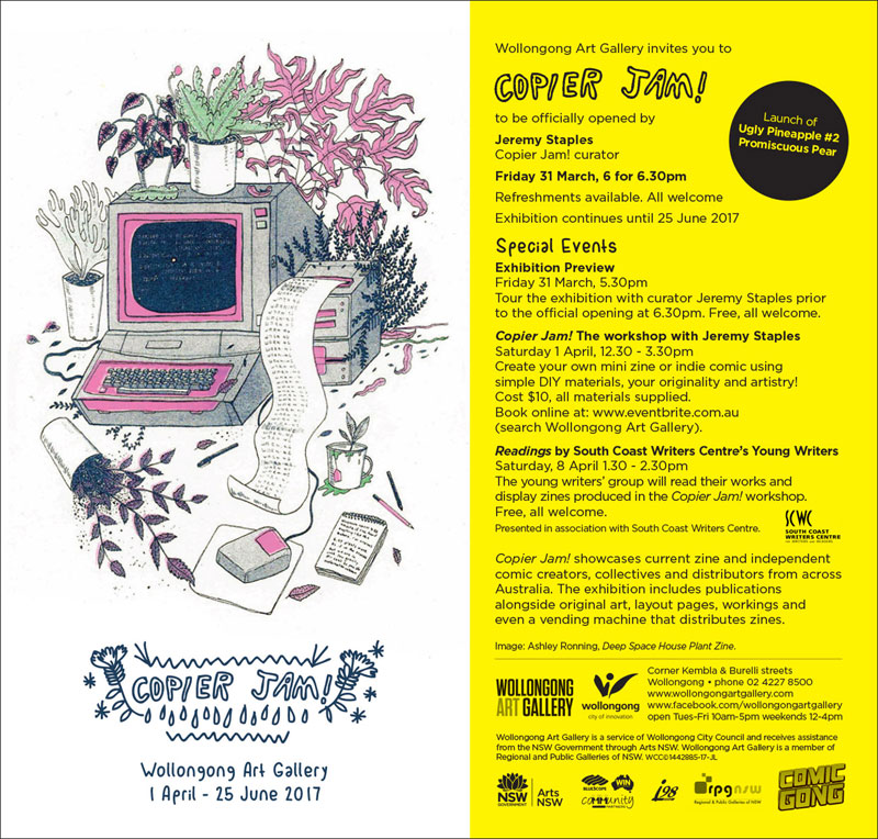 Copier Jam! is an exhibition showcasing current zine and independent comic creators, collectives and distributors from across Australia. The exhibition includes the publications alongside original art, layout pages, workings and even a vending machine that distributes zines.